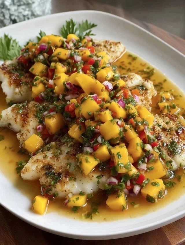 Plate the tilapia and generously spoon mango salsa on top.